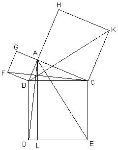 The majority of the remaining propositions of the Elements are dependent upon these constructions. Also contained in the propositions of Book I are the theorems on congruent triangles, known to today's high-school geometers as ``Side-Angle-Side'' (I.4), ``Side-Side-Side'' (I.8), ``Angle-Side-Angle'' (I.26), and ``Angle-Angle-Side'' (also I.26). The uniqueness of a triangle with given sides is proved in I.7. In I.22, Euclid shows how to construct a triangle from any three given lines (provided that it is possible). That the angles of a triangle sum to two right angles is proved in I.32. Propositions 9 and 10 call for the bisection of a given angle and line segment, respectively. That the opposite angles formed by intersecting lines are equal is proved in I.15. Propositions 27-31 deal with parallel lines; in I.31, Euclid constructs a line parallel to a given line, passing through a given point not on the line. The existence of parallelograms is proved in I.33; following this proposition are many theorems about parallelogrammic figures and the areas they enclose. Proposition 42 calls for the construction in a given angle of a parallelogram equal in area to a given triangle. This idea is extended in I.45 to the construction in a given angle of a parallelogram equal in area to a given rectilinear figure. The construction of a square on a given line is given in I.46. Finally, propositions 47 and 48 represent the so-called Pythagorean Theorem and its converse. The proof of I.47, based on a figure known as the ``bride's chair,'' is believed to be original with Euclid. [64] |
